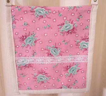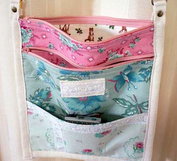 後はピンク系の生地にブルーのバラの花 レースを付けています。 サイズ:幅24cmx高さ22cm 肩ひも長さ113cm |