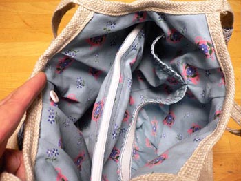 ファスナー付きの中仕切りと片側にゴム付きのポケット