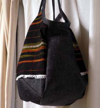 | 黒地に赤、黄、白のストライプ生地(絣風、着物地使用)と ダンガリー黒生地使用 切り替え部分に綿レースを挟み込んでいます。 口部はボタンにワックスコードを引っ掛けるようにしています。 |