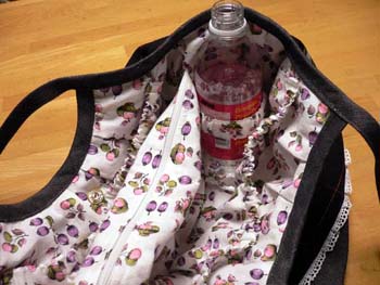 | 内布はフルーツ模様のヴィンテージ布使用。 両側にゴム入りのポケットあり。 ファスナー仕様の仕切りポケットもあります。 内側のマチ部分にペットボトルなどを入れられる ゴムバンドを2つ付けています |