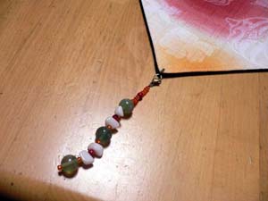 三角に仕上げた端の部分に天然石のビーズで飾りを付けました。